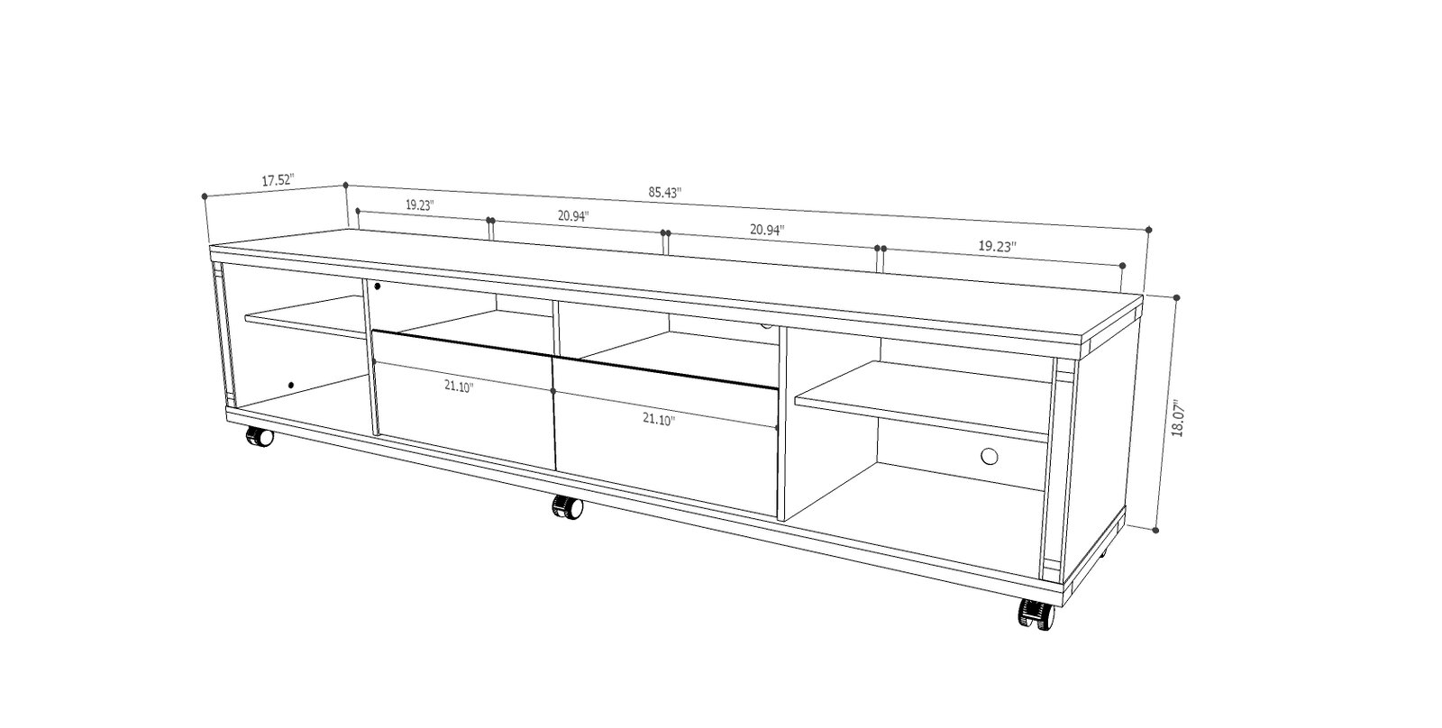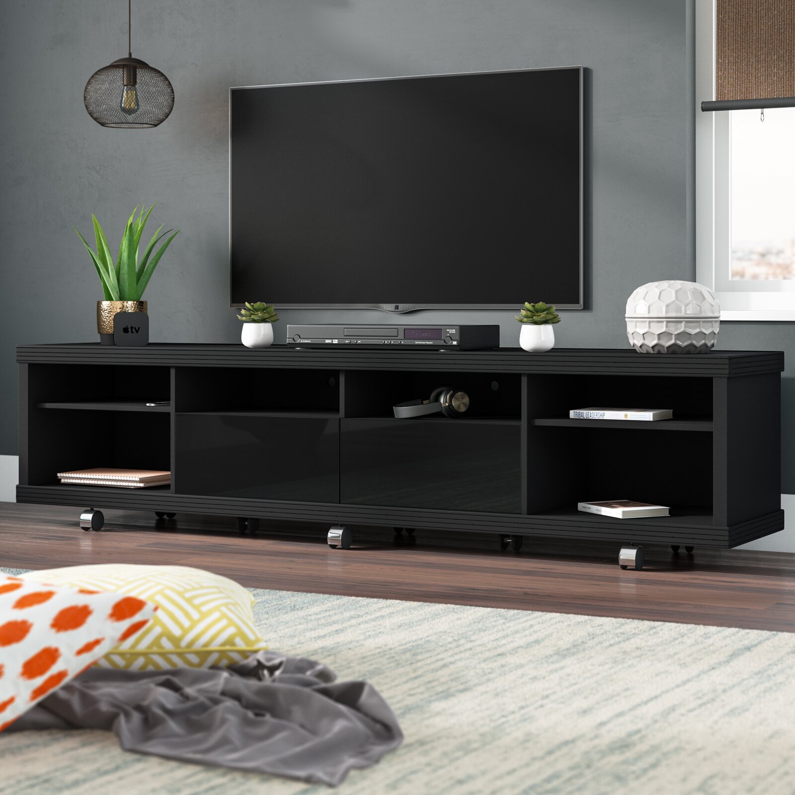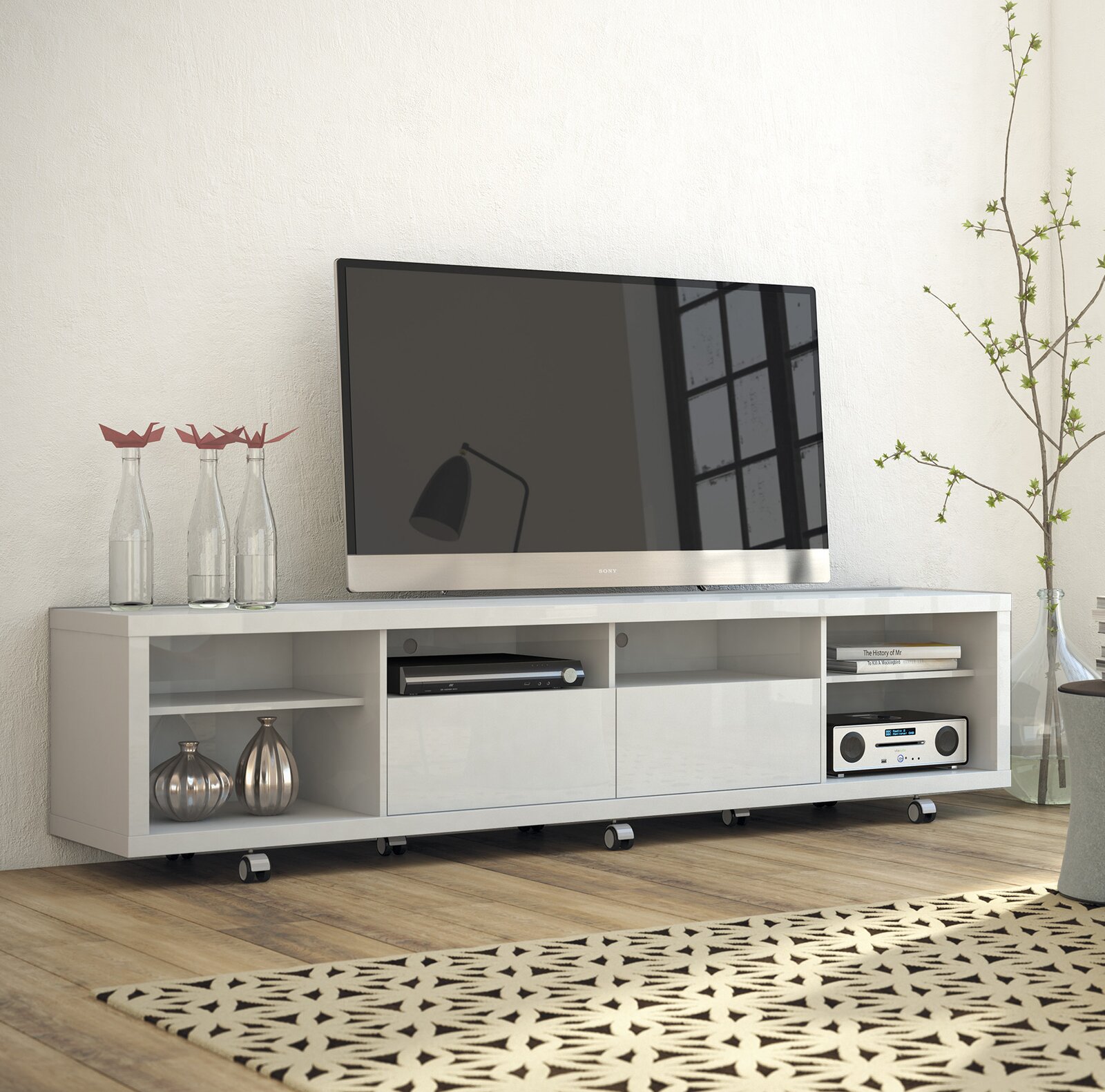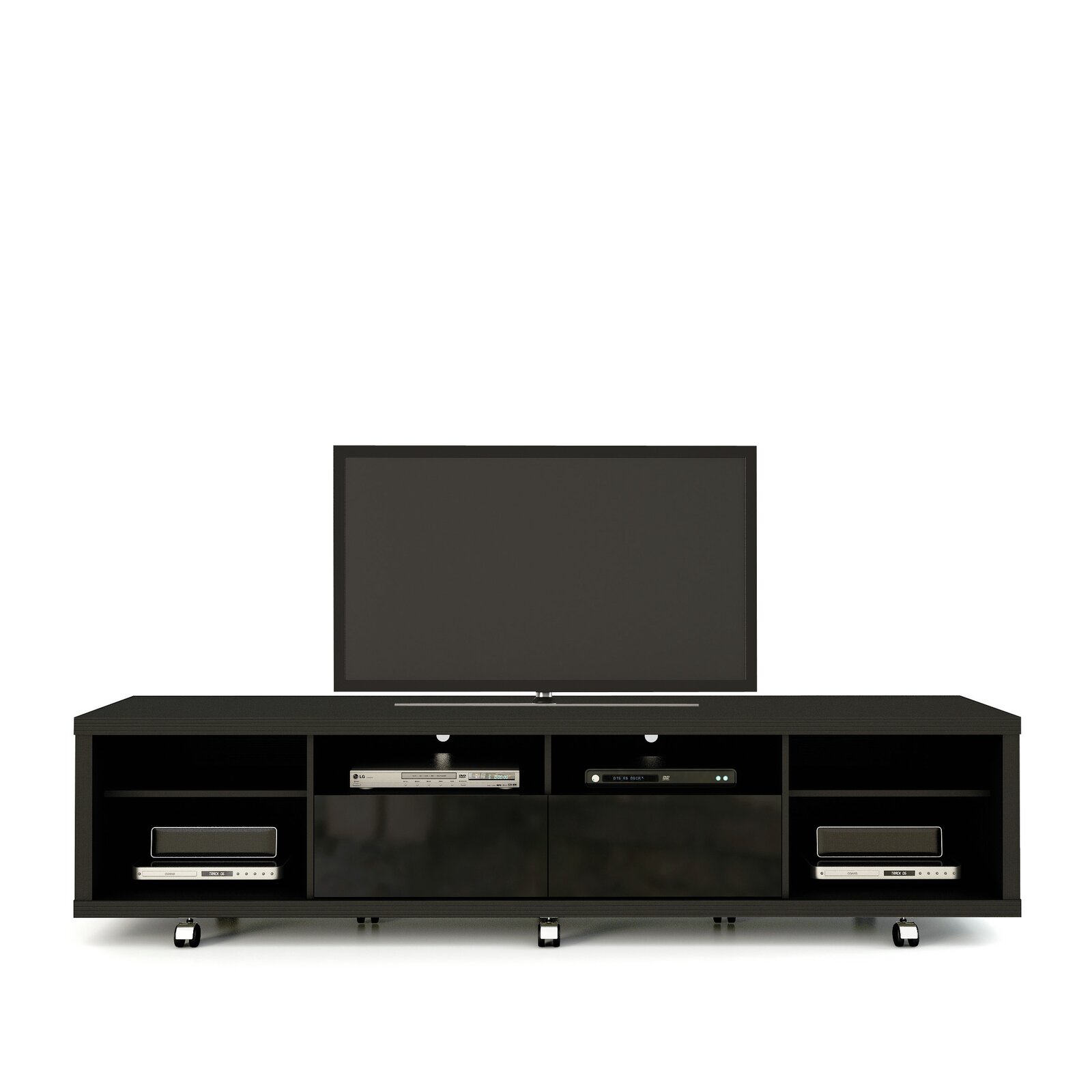 With its 6 open shelves and 2 drawers, this clean-lined TV stand lends ample storage for your entertainment ensemble. Use it to round out a contemporary living room arrangement, then use its space to stow...